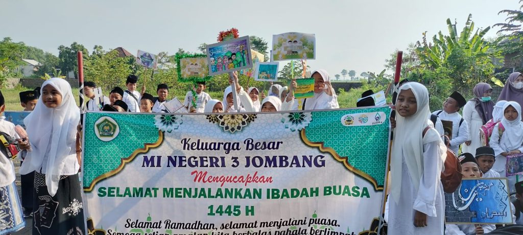 Kab. Jombang ( MIN 3 Jombang ) – MIN 3 Jombang melaksanakan gelar pawai dalam rangka menyambut bulan suci Ramadan 1445 Hijriah bertempat di MIN 3 Jombang pada Sabtu (09/03). Terlihat hadir seluruh Guru/Pegawai, ustadz ustadzah Taman Dirosah Al-Qur’an, dan siswa siswi MIN 3 Jombang, dari kelas 1 sampai kelas 6.