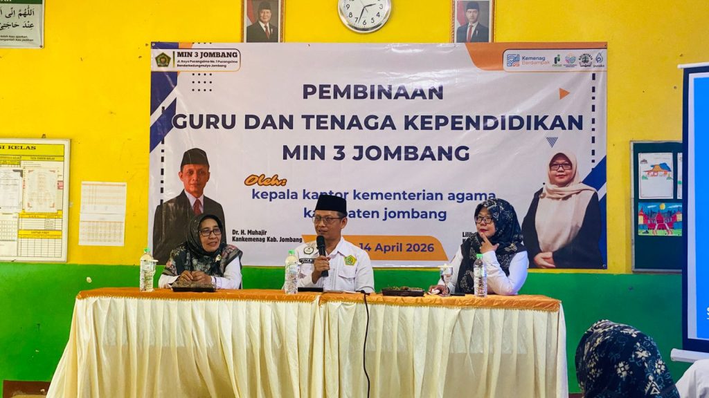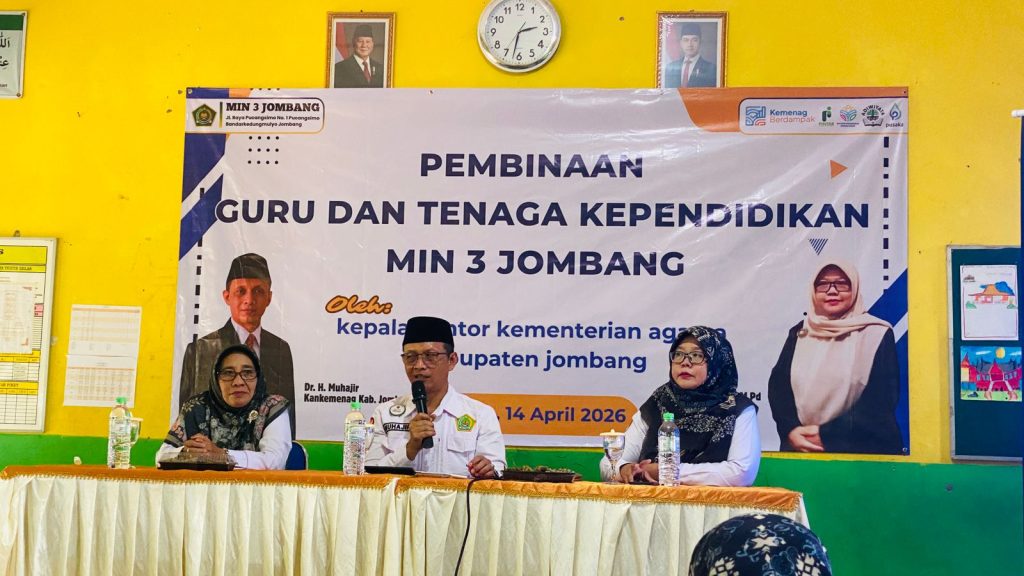 Jombang, 14 April 2026 — Seluruh Aparatur Sipil Negara (ASN) Guru dan Tenaga Kependidikan (GTK) MIN 3 Jombang mengikuti kegiatan pembinaan yang diselenggarakan pada Selasa (14/4) di lingkungan madrasah. Kegiatan ini menghadirkan Kepala Kantor Kementerian Agama Kabupaten Jombang, Dr. H. Muhajir, sebagai pembina utama.